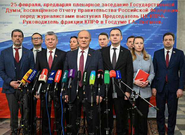 25 февраля, предваряя пленарное заседание Государственной Думы, посвященное отчету правительства Российской Федерации, перед журналистами выступил Председатель ЦК КПРФ, Руководитель фракции КПРФ в Госдуме Г.А. Зюганов.