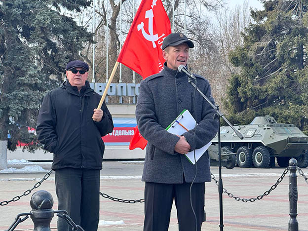 Митинг открыл секретарь Пролетарского районного отделения КПРФ Февралёв М.А. Он поздравил участников митинга с праздничным днём и зачитал поздравление от председателя ЦК КПРФ Зюганова Г. А.