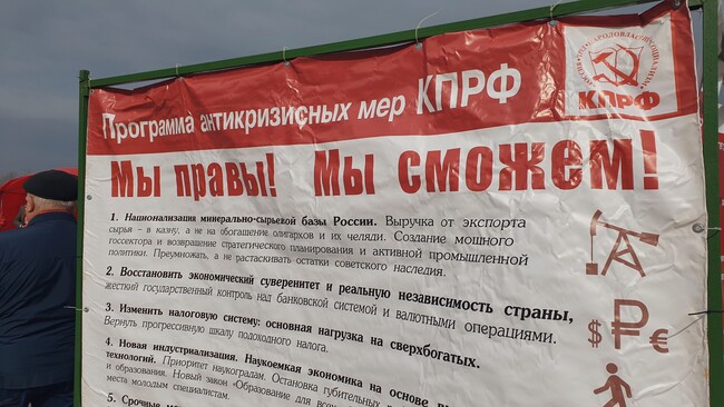 «...В условиях "гибридной" войны на уничтожение, объявленной России Западом, КПРФ настаивает: и на фронте, и в сражениях за экономическое и социальное процветание страны настоящую победу принесёт только курс, опирающийся на идеологию справедливости и социального равенства. На опыт выдающихся достижений советской эпохи, социалистического строительства. Программа Победы КПРФ, включающая в себя предложения по национализации минерально-сырьевой базы, стратегических отраслей промышленности и сферы ЖКХ, формированию бюджета развития, возвращение прежнего возраста выхода на пенсию, является научно обоснованным планом социалистического возрождения России. Только её воплощение в жизнь способно вывести страну из кризиса капитализма...» - отмечается в резолюции.